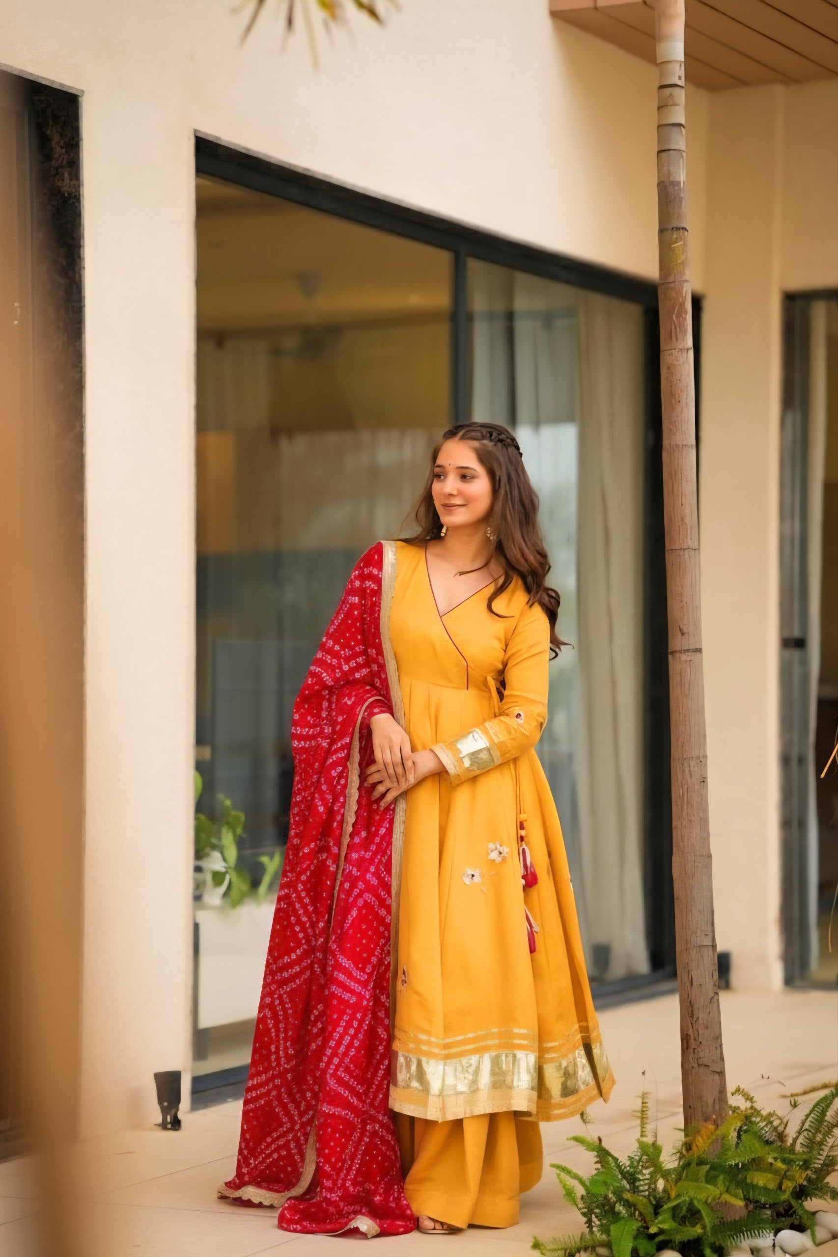 #plazzoset #anarkalikurti #kurtaandplazzo #bandhanidupatta #ethnicwear #festivewear #desioutfits #handmadework #gottapatti #kurtilove #newarrival #instafashion
